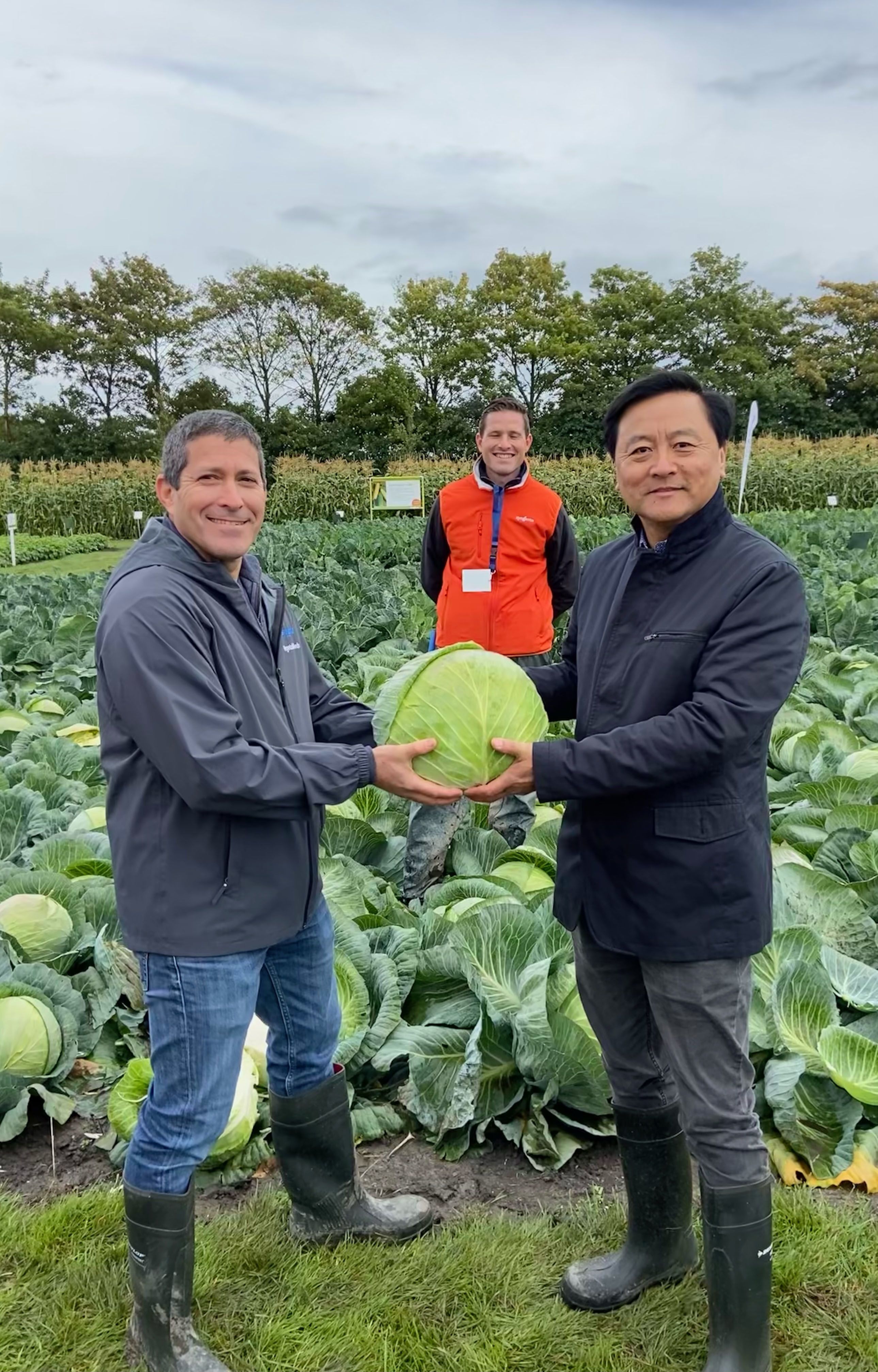 Uri Krieger, left, Head of Vegetables and Flowers R&D, with Gusui Wu, Global Head of Seeds Research, right. Back center: Twan Groot, Cabbage Breeding Project Lead.
